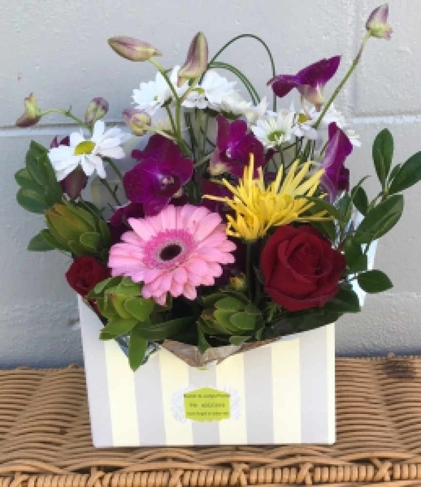 Want something different, try our New Envelope Box arrangement. A cute envelope shaped box filled with luscious Singapore orchids & mixed flowers .Great for a work friend, or for the Hospital , or any occasion
