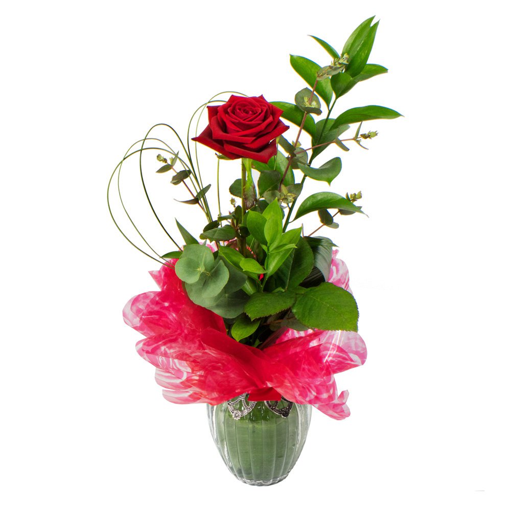 A single red rose delivered in a simple vase by your chosen florist.